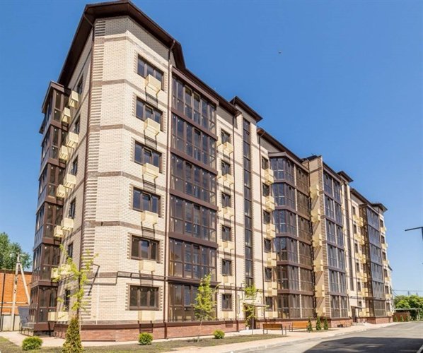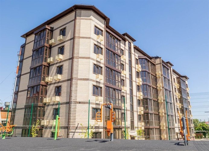 Это современный кирпичный шестиэтажный дом с панорамным остеклением